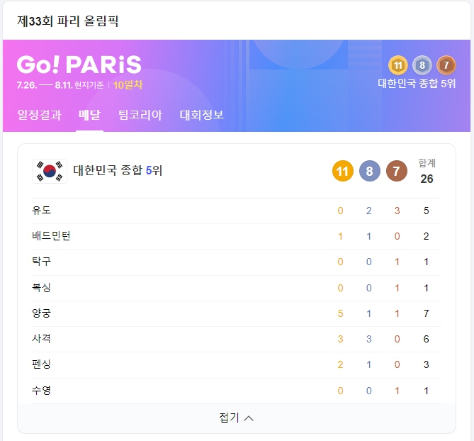 | 2024 파리 올림픽 메달 순위 및 10,11일 남은 경기 일정, 폐막식은? (0) | 2024.08.10 |